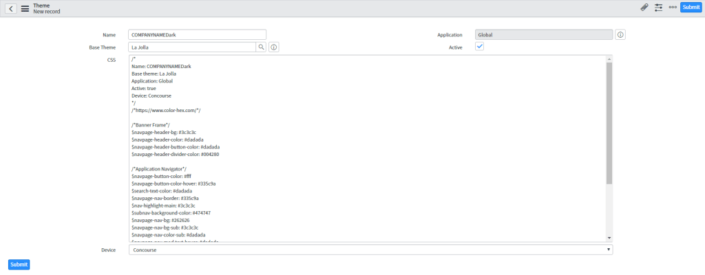 I’ll provide you two examples of themes, a dark and a light one. Maybe you’ll need to play with your color variables to get the best suited design for your instance. In some cases you could set one color to two variables and the worst could be to no longer see your text. The best is to test your custom CSS themes in your companies dev instance or your personal dev instance. 😉